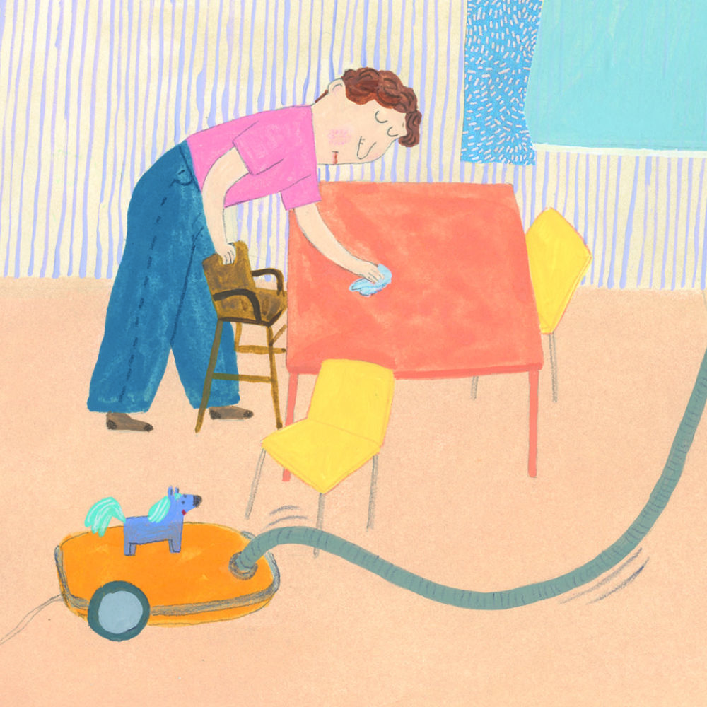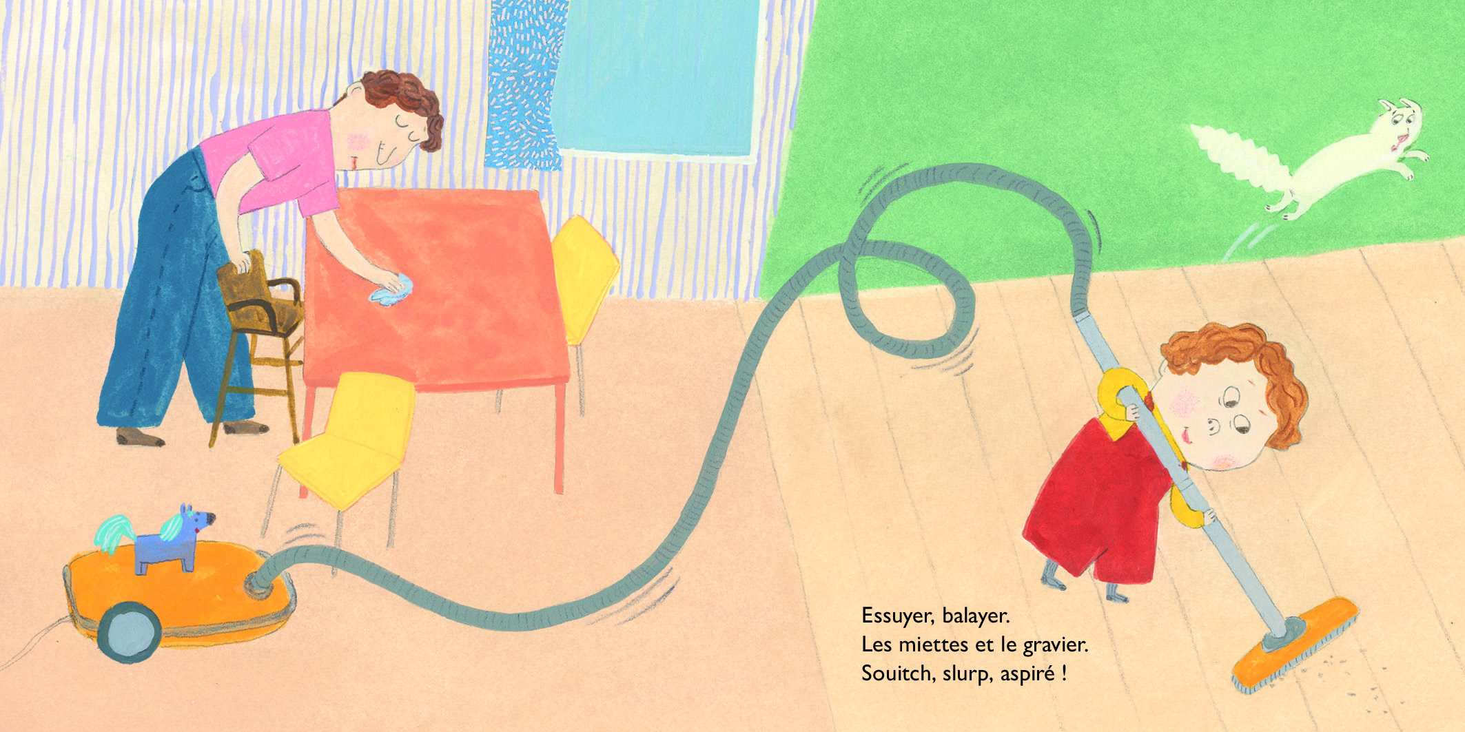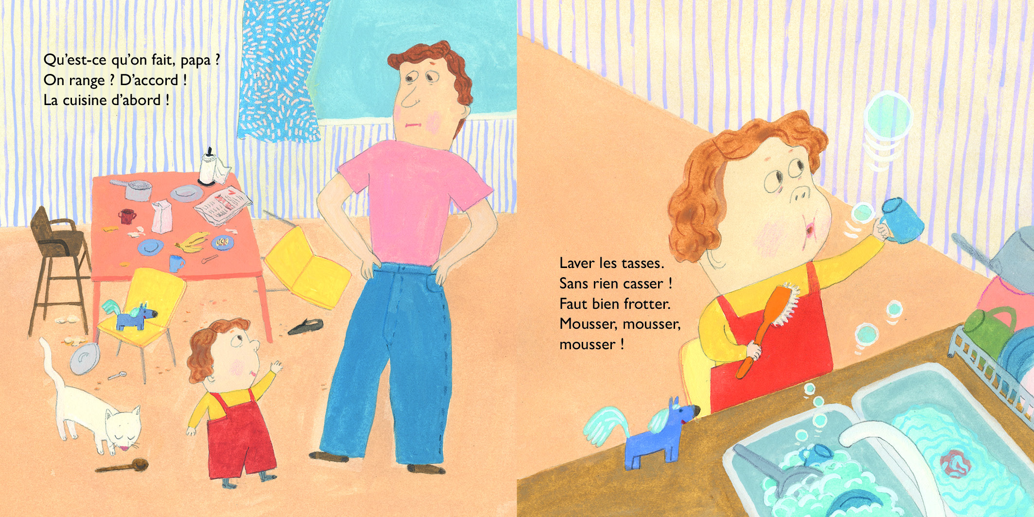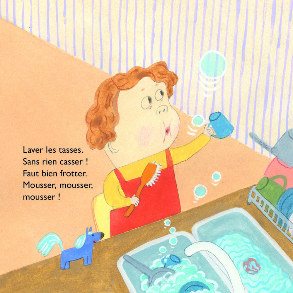 Qu’est-ce qu’on fait, papa ? On range ? D’accord ! La cuisine d’abord ! Faut bien frotter. Mousser, mousser, mousser ! Essuyer, balayer. Les miettes et le gravier. Flaques de serpillère Moi je dépoussière même la souris et mes gribouillis.
