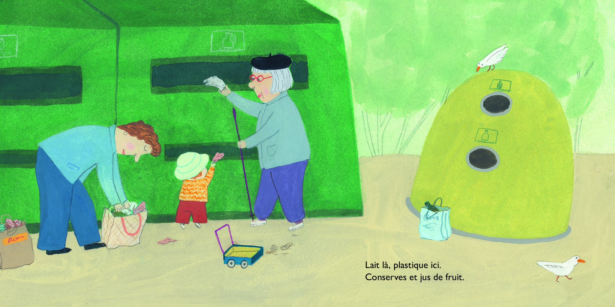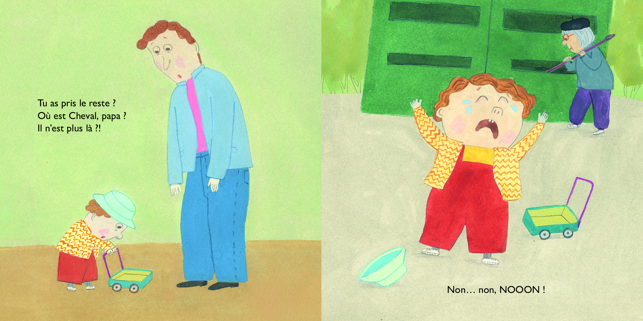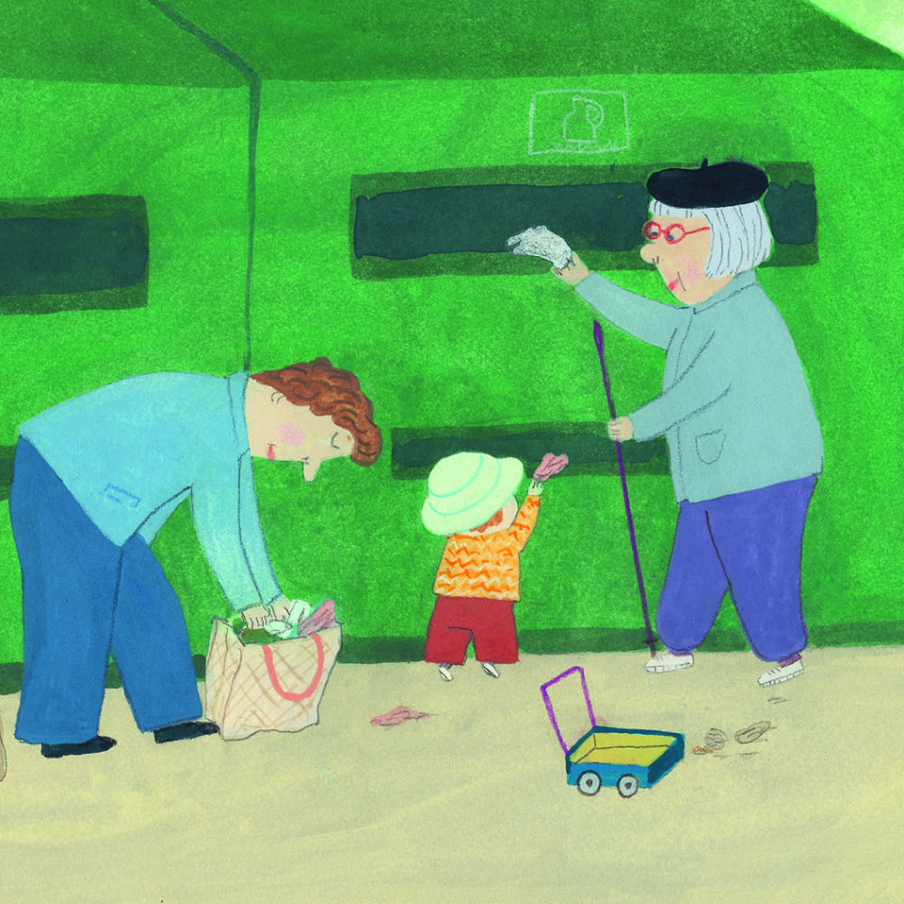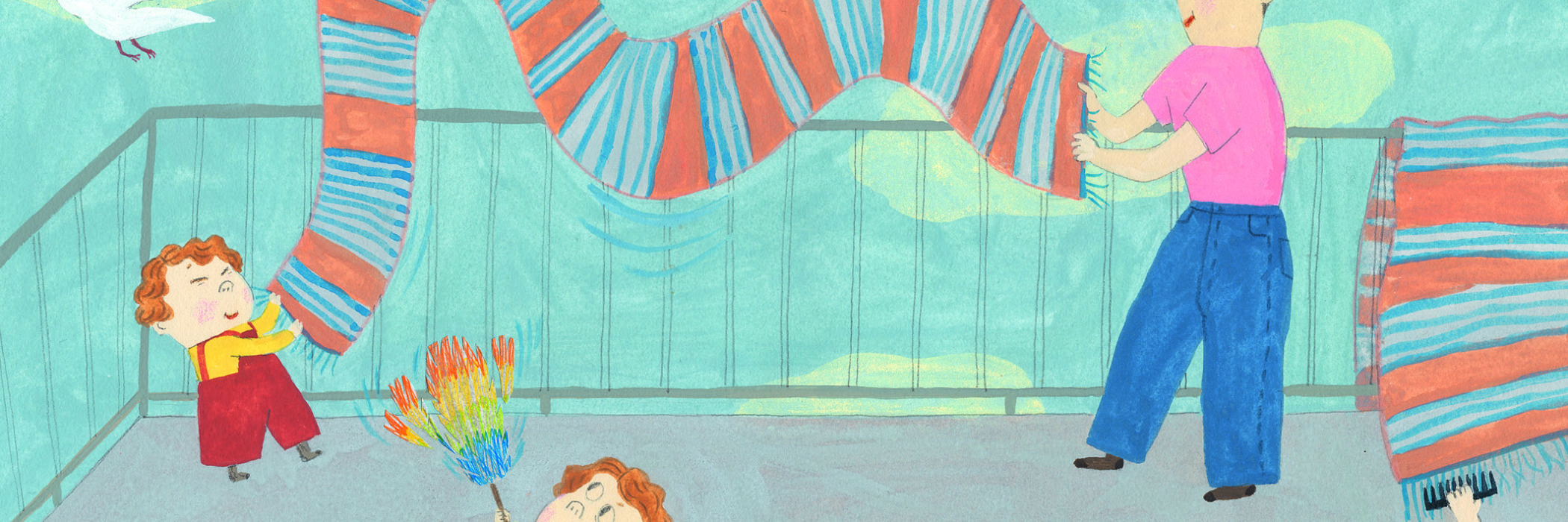 Qu’est-ce qu’on fait, papa ? On range ? D’accord ! La cuisine d’abord ! Faut bien frotter. Mousser, mousser, mousser ! Essuyer, balayer. Les miettes et le gravier. Flaques de serpillère Moi je dépoussière même la souris et mes gribouillis.